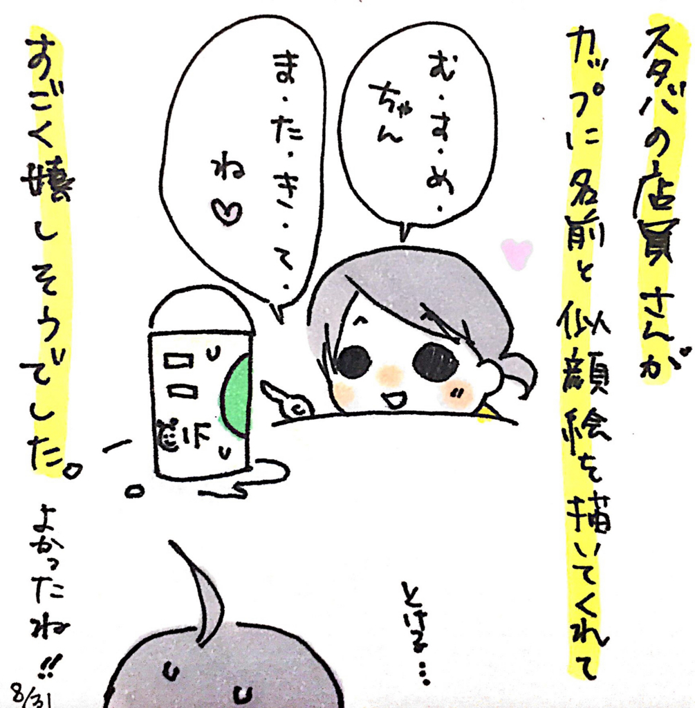それが出産後に子連れで店舗に行くようになったら、描いてもらえる頻度が少しだけ上がりました。だいたいスマイルマークみたいなちょっとしたイラストで、今回みたいながっつりメッセージ入りのものは初めてです。空いてたからかな、今日。